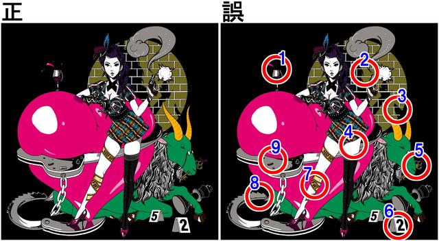 前に投稿した「間違い探し」の正解を発表します(^^)(1)ワインの跳ね方(2)レンガの溝(3)ツノの影(4)スカートの影(5)カギのデザイン(6)番号札の位置(7)黒い文字(8)手錠の影(9)手錠のピン