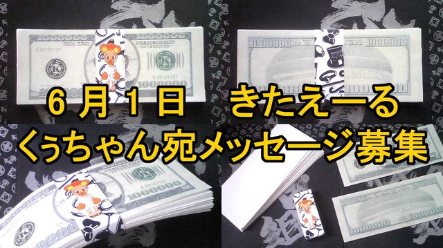 ●6月1日のJAPONESQUEツアー北海道公演でくぅちゃん宛のメッセージを集めて、1つのプレゼントにしてライブ会場のスタッフさんに渡します(^^)●プレゼント内容は、メッセージを書いてもらった紙をこの写真のようにバースデーライブの札束にしてプレゼントします(^^)●札束は裏表2枚がお札の絵柄で、中の98枚が白紙になっています(^^)この白紙がくぅちゃんへのメッセージ用紙になります(^^)●お札の大きさ「タテ7.5cm×ヨコ19cm」のサイズに切った紙にくぅちゃん宛のメッセージを書いて欲しいです(^^)●ライブチケットが届いたらpeeproomのプロフィール画像に座席番号を掲載するので、ライブ当日に会場内でメッセージを書いた紙を渡して下さい(^^)●ペンと用紙50枚ほどを用意しておくのでその場で書いて渡して頂いてもOKです(^^)●ガラケーなのでライブ当日にpeeproomからメッセージや問い合わせを頂いても返信は出来ないのでご注意下さい(^^)よろしくお願いします\(^O^)/